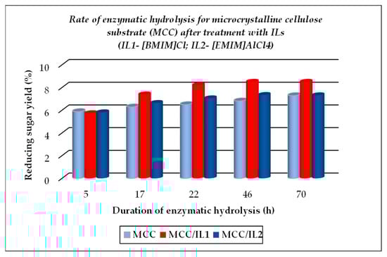 Efficient enzymatic hydrolysis of cellulose substrates is closely related to the decrease in the degree of polymerization of cellulose [48], which has been observed during pre-treatments with ILs [78,84]. The authors’ previous studies [54,55,56] evidenced that pre-treatment with ILs modified the crystalline ordered structure of cellulose substrates (namely Asclepias syriaca seeds floss and poplar seed floss) with a positive impact on the enzymatic hydrolysis rates by increasing the accessibility of crystalline fraction of cellulose. A significant degradation process of both materials by pre-treatment with 1-ethyl-3-methyl-imidazolium-tetrachloroaluminate [EMIM]Cl-AlCl3 was evidenced [56]. This process was caused by the increased acidity of the reaction medium which contributed to the enhanced depolymerization of cellulose and hemicelluloses by the hydrolysis down to smaller fractions.