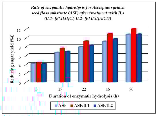 The TCI value for cellulose substrates showed an increase after treatment using ILs, with or without further enzymatic hydrolysis, while LOI and HBI values were lower under the above-mentioned treatment conditions as compared to the raw materials. The crystallinity changes that occurred were closely related to the different chemical structures of ILs used for treatment. A significant gain when using ILs for the dissolution of cellulose substrates is represented by their positive effects on the further enzymatic hydrolysis, expressed by the increased corresponding rates, as exemplified below (see Figure 5, Figure 6 and Figure 7, which were drawn by the authors). This feature is closely related to the increasing fraction of amorphous cellulose during the enzymatic treatment on account of the decreasing crystalline cellulose fraction. Some differences are noticed when 1-ethyl-3-methyl imidazolium aluminium tetrachloride [EMIM]AlCl4 is used for the dissolution of cellulose substrates, because of the increased acidity of the reaction medium which contributed to the enhanced depolymerization of polysaccharides components (cellulose and hemicelluloses) by the hydrolysis down to smaller fractions (in other words, a more intense degradation process of the cellulose substrates occurred). Its effect is less pronounced in comparison with 1-buthyl-3-methyl imidazolium chloride [BMIM]Cl, but important also are the different structural features of cellulose substrates (ASF is composed of 54.9% cellulose, 8.0% hemicelluloses, 19.3% lignin, and 0.9% ash, while PSF is composed of 62.07% cellulose, 17.04% lignin, and 2.5% ash [56]). As one can observe from Table 2, the nature of the raw cellulose materials (mainly the degree of polymerization and crystallinity of cellulose in relation to the kind of cellulose substrate: pure cellulose, cellulose-rich materials, or lignocellulose) influences, to a large extent, their behavior under different treatment conditions, mainly when using ILs prior to the enzymatic saccharification.