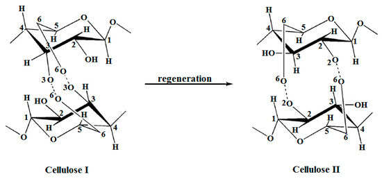 Alkaline treatments aim at biomass delignification as a result of lignin removal (by breaking the ether bonds) and solubilization of hemicelluloses (via saponification of intermolecular ester bridges between lignin and hemicelluloses), yielding in an increased porosity and cellulose accessibility. Unlike hemicelluloses, cellulose is rather stable under alkaline conditions, although certain depolymerization processes occur along with the random cleavage of cellulose macromolecular chains and the formation of small molecules (e.g., lactic acids) that are able to undergo further processing [188]. Still, concentrated alkaline solutions (NaOH aq. sol. 8 to 20%) were reported to cause swelling and dissolution of the native cellulose I, but only cellulose II polymorph (the main features of the supramolecular structures of these cellulose polymorphs are illustrated in Figure 8) resulted upon recrystallization after neutralization (a process known as mercerization).