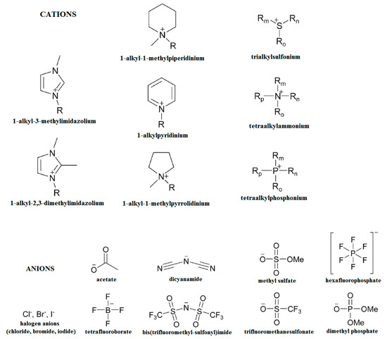 The organosolv fractionation was considered as well. Water and organic solvents can cause a significant swelling of the biomass since they penetrate the amorphous regions by hydrogen bond interactions and perturb the rigorous supramolecular structure of crystalline cellulose. As a result, lignin and hemicelluloses are solubilized and sometimes even degraded. The literature is abundant in studies that report on various solvents and the specific conditions (most organosolv systems evolve as autocatalytic processes at high temperatures) used for this type of treatment [32]. It is well known that the low solubility of cellulose in water is enabled by the hydrogen bonding and hydrophobic interactions so that strong intrinsic cohesion forces do not allow the disruption of the crystalline network. Therefore, a new generation of solvents was required, solvents able to access the cellulose macromolecular chains by physical intermolecular interactions (non-derivatizing solvents) or by labile, short-termed chemical interactions that evolve through ester-, ether-, or acetal-type intermediates (derivatizing solvents). Aside from the classic polar protic and aprotic solvents and mixtures of solvents, another group of solvents that can act in both ways is represented by the ionic liquids (ILs) [90,208]. Such solvents have been shown to be effective in reducing the cellulose crystallinity. Thus, 1-allyl-3-methylimidazolium chloride (AmimCl) and 1-ethyl-3-methylimidazolium acetate (EmimAc) have been employed for cornhusk cellulose which presented a decreased crystallinity, from 59.6% to 48–49%, after regeneration from ILs [209]. 1-N-butyl-3-methylimidazoliumchloride ([C4mim]+Cl−) has been used to solubilize cellulose from filter paper and WAXD patterns confirmed that regenerated cellulose showed peaks characteristic of allomorph cellulose II, which has a reduced crystalline index, and their intensity was significantly diminished [210]. The most common cations and anions employed in IL formulations are presented in Figure 9.