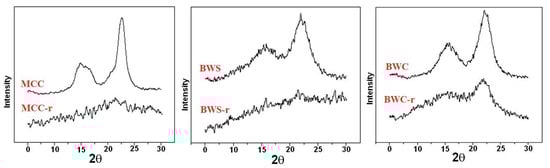 An interesting feature is related to the peak at 2900 cm−1 attributed to the C-H and CH2 stretching, which remained unaffected by changes in crystallinity (related to changes in hydrogen bond networks that were disrupted) caused by the considered treatments (ionic liquid and subsequent regeneration) [117]. A high index value indicated that the cellulose material has a significant crystalline domain with a highly ordered structure. The TCI values significantly decreased for substrates comprising dominantly cellulose, namely MCC and BWC, after treatment with IL and the regeneration process (Table 1). This indicates that a part of the crystalline structure of cellulose was transformed into its amorphous allomorphs [125]. Thus, the structural changes caused by the interaction of cellulose substrates with IL were due to the altered crystalline phase and decreased degree of intermolecular regularity.