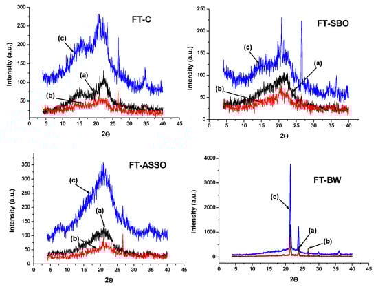 The XRD method evidences in the resulting diffractograms relatively sharp and strong reflections attributed to the crystalline part of cellulose and broader signals characteristic to the non-crystalline part. The peak height method [99] is an empirical evaluation of the crystallinity index (CrI) calculated as the ratio of the intensity of the crystalline signal (I002-IAM) and the total intensity (I002) according to the following equation,