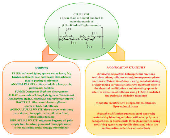 A detailed schematic of cellulose chemical structure, its main sources, and modification strategies employed to obtain advanced cellulose derivatives.