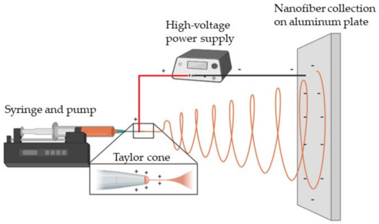 A schematic representation of the electrospinning process used for AX nanofiber fabrication. Created with www.BioRender.com (accessed on 22 October 2024).