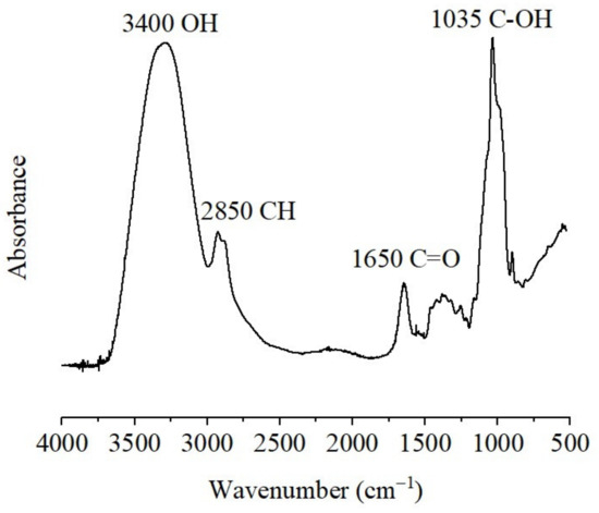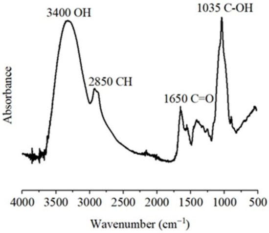 Figure 3 presents the Fourier transform infrared (FTIR) spectrum of the AXs. The sample produced a pattern consistent with that reported by different authors for AXs [3,11]. The main band at 1035 cm−1 was associated with C-OH bending. The tiny signals registered at 1158, and 897 cm−1 were related to the C-O-C antisymmetric stretching mode of the glycosidic link and β(1→4). The absorption band at 1650 cm−1 was attributed to phenolic acids and associated proteins in the sample. In addition, the stretches at 3400 cm−1 and 2850 cm−1 corresponded to the vibration of OH and CH structures, respectively [1].