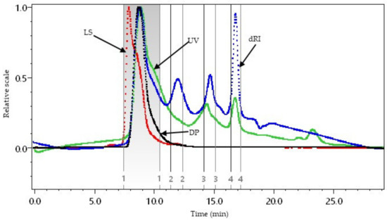 Figure 5 presents the AX elution profile generated from high-performance size-exclusion liquid chromatography coupled to a multiangle laser light scattering detector (SEC-MALS), where the dRI, UV, light scattering (LS), and the degree of polymerization (DP) are shown. The AXs produced a monomodal LS and DP signal with the LS peak at a lower elution time than the DP and the prominent dRI peak (Fraction 1, between 7.5 and 10.5 min). The low elution time for the LS peak could have been due to the formation of polysaccharide macro-aggregates. The dRI signal presented various peaks (Fractions 2–4) and large elution volumes, indicating dispersity. The UV peaks in the sample could be related to peptides that may be linked to AXs, as reported in the literature [3], and to FA esterified to these polysaccharides [11,16].
