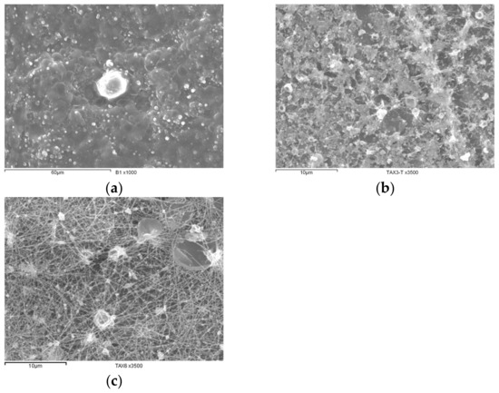 The scanning electron microscopy (SEM) images of the most representative materials obtained from the different AX dispersions submitted to the electrospinning process reported in Table 2 are presented in Figure 7.