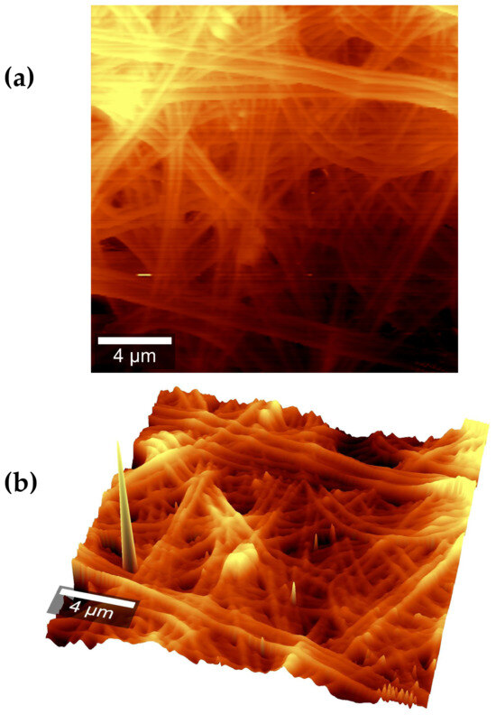 Figure 9a shows the atomic force microscopy (AFM) of the electrospun nanofibers. These had an irregular surface with lumps and imperfections. Figure 9b shows that the nanofibers were deposited in layers, and those deposited on top of the rugs were coplanar.