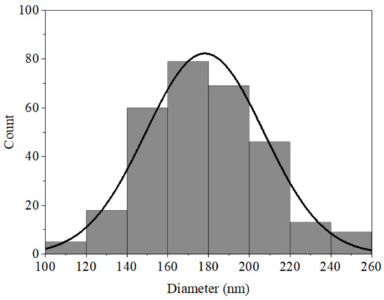 As for the many fibers in Figure 7c, it was possible to generate a histogram of AX nanofiber diameters (Figure 10). All the observed fibers had diameters of a nanometric order of magnitude ranging from 100 nm to 260 nm, with the majority the diameters around 170 nm and an average diameter of 177 nm. The diameter of the fibers meets statistical normality and fits a Gaussian bell.