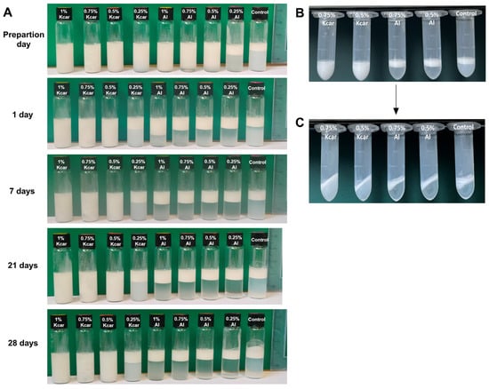 (A) Emulsions containing 20% (v/v) MCT and 0.5% (w/v) Sh-NP with 1–0.25% (w/v) added Kcar or Al compared to a control emulsion monitored over time, and emulsions with 0.75% and 0.5% (w/v) of added Kcar or Al and a control emulsion (B) before and (C) after centrifugation at 10,000× g for 45 min.