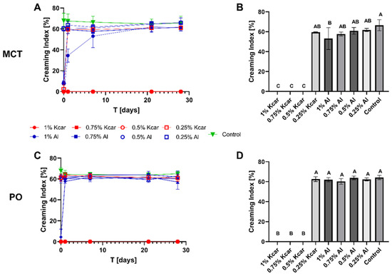 CI of emulsions (20% MCT or PO) with 0.25–1% (w/v) Kcar and Al vs. a control emulsion over time (A,C) and the average CI% after 7 days (B,D). Different uppercase letters (A–C) indicate significantly different CI values (p ≤ 0.05).
