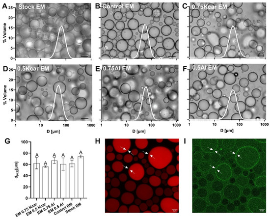 (A–F) Microstructure analysis and size distribution of the emulsions containing 40% MCT (stock) and 20% MCT emulsions with 0.75% and 0.5% (w/v) Kcar or Al and the control without polymers and (G) their corresponding average d(4,3); bar in all images = 50 µm. (H) A fluorescent image of a control emulsion containing 20% MCT with 0.027 mg/mL NR and 0.5% (w/v) shellac-fluorescein NPs, which shows the MCT dyed with NR; bar = 10 µm and (I) the NPs dyed with fluorescein; bar = 10 µm. The arrows point to the oil–water interface of three oil droplets to show the NP accumulation. The same uppercase letters (A) indicate statistically insignificant differences in droplet size values (p > 0.05).
