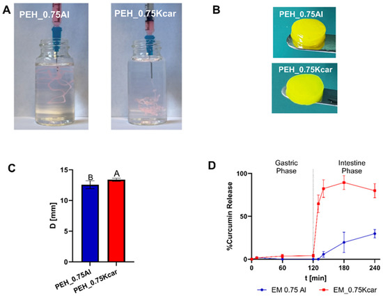 (A) PEHs containing 20% MCT and 0.75% (w/v) Al or Kcar containing 0.027% NR injected and crosslinked in situ, (B) PEHs containing 0.02% (w/v) curcumin crosslinked in a mold, (C) their average diameter, and (D) the release profile of curcumin from PEHs based on 0.75% Al or Kcar in an in vitro simulated gastric model. Different uppercase letters (A, B) indicate significantly different PEH diameters (p ≤ 0.05).