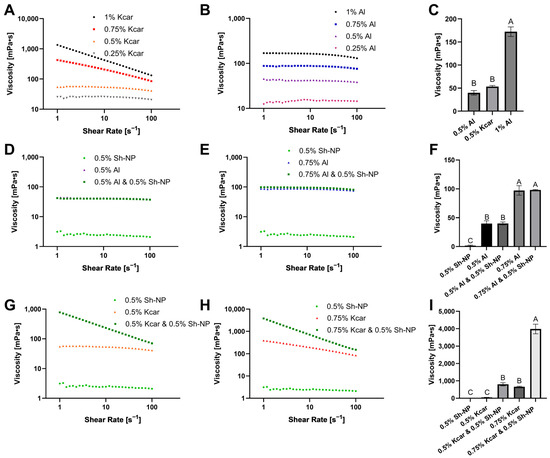 The apparent shear viscosity of the Al and Kcar solutions (0.25–1% (w/v)), 0.5% (w/v) NP solutions, and the mixtures of 0.5% and 0.75% (w/v) Al or Kcar were measured using an MCR 302 rheometer (Anton Paar GmbH, Graz, Austria) with a 50 mm parallel plate geometry (sanded surface) and a gap of 0.5 mm. The mixtures were free-flowing solutions. All measurements were performed at a constant temperature of 25 °C. The apparent shear viscosity was measured by decreasing the shear rate from 100 to 1 s−1. All the measurements were carried out in triplicate.