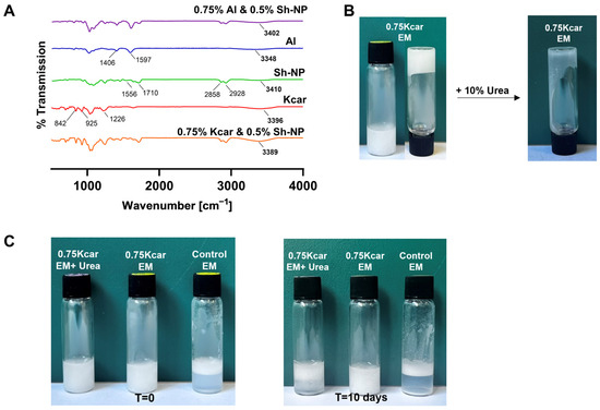 Figure 1A shows that the control emulsion exhibited creaming immediately upon preparation, with the cream layer remaining stable throughout the monitoring period. This behavior was consistent with previous observations of Pickering emulsions that contained isopropyl myristate stabilized by Sh-NPs, which also exhibited creaming [15]. Creaming was also observed in all the emulsions with added Al. Qualitatively, the height of the serum layer increased with the Al concentration on the day of preparation, but differences between the samples seemed to diminish over time, with the exception of the highest Al concentration, for which the cream layer was somewhat thicker. Thus, Al delayed creaming for a limited time but could not effectively prevent it. In contrast, when examining the emulsions with added Kcar, creaming was only evident at the lowest concentration of 0.25% (w/v) Kcar, while the emulsions that contained higher concentrations did not exhibit any creaming throughout the observation period. Hydrophilic polymers, such as Al and Kcar, inhibit creaming mainly due to the restricted movement of oil droplets under gravity, which is caused by the higher viscosity of the continuous phase [12]. Since the dissimilar effects of Al and Kcar could have arisen from variations in viscosity, we conducted further investigations to assess whether this was the mechanism, as described in Section 3.3.