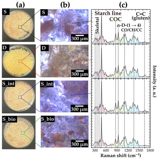 The evaluation of morphological and molecular structural properties of the wheat matrix samples is accomplished through micro-Raman spectroscopy analysis. Representative pictures, optical microscope images, and deconvolved Raman spectra of S, D, S_int, and S_bio samples before irradiation are shown in Figure 1.