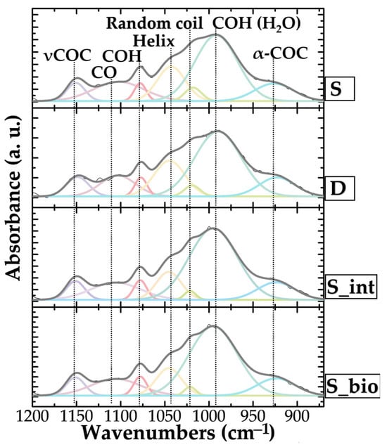 Further information on the starch units’ organization is obtained through the analysis of the carbohydrate fingerprint region, which contains starch-related bands sensitive to changes in the assembly of starch molecules. Representative deconvolved FTIR-ATR spectra recorded between 1200 and 870 cm−1 for S, D, S_int, and S_bio samples are reported in Figure 3.
