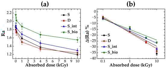 Investigations on the side effects produced by gamma irradiation on the molecular structural properties of the wheat samples are accomplished through micro-Raman spectroscopy analysis. Representative spectra of S, D, S_int, and S_bio samples before and after irradiation at absorbed dose values of 0.1, 1, 4.5, and 10 kGy are shown in Figure S1 in the Supplementary Materials. At first glance, the Raman spectra of the wheat samples are rather indistinguishable before and after irradiation, even at 10 kGy. To better appreciate the effect of irradiation on the samples, Figure 5 presents the Raman spectroscopy data in terms of the parameter and the percentage variation in the “Δ()%” calculated with respect to the value of the unirradiated samples.