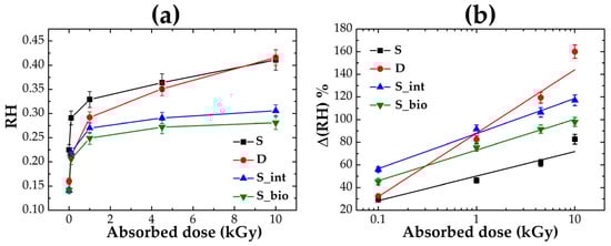 Information on the side effects produced by gamma radiation on the chemical composition and conformation of the wheat samples is obtained through FTIR-ATR spectroscopy analysis. Representative FTIR-ATR spectra of S, D, S_int, and S_bio samples after irradiation at absorbed dose values of 0.1, 1, 4.5, and 10 kGy are shown in Figure S2 of the Supplementary Materials. In more detail, Table S2 reports the CI and OI values derived for each typology of sample in each irradiation condition. In perfect agreement with other studies, both CI and OI parameter values increase as a function of the absorbed dose. This finding is an unavoidable consequence of the interaction between gamma rays and organic materials [,,,,,].