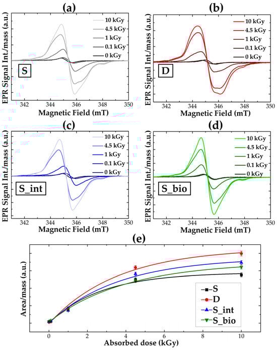 EPR spectra for (a) S, (b) D, (c) S_int, and (d) S_bio samples before and after irradiation; (e) trend of the EPR signal area as a function of the absorbed dose values.