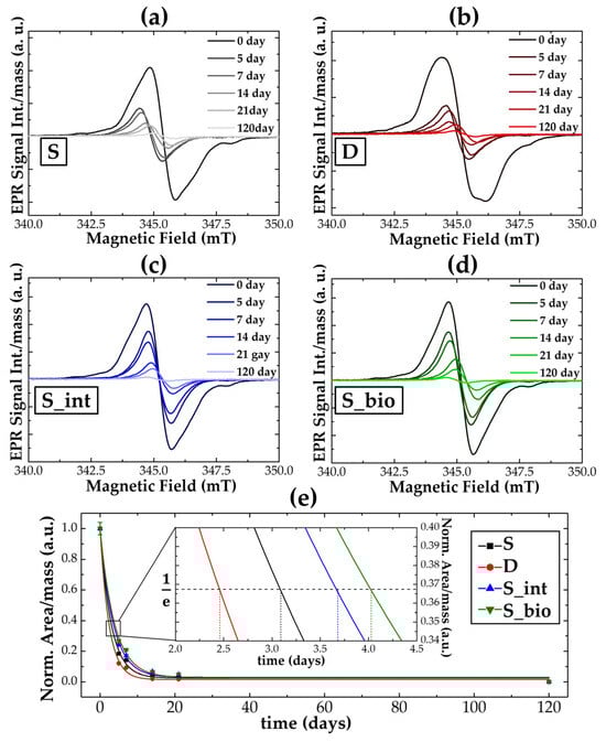 EPR spectra for (a) S, (b) D, (c) S_int, and (d) S_bio samples at 0, 5, 7, 14, 21, and 120 days after irradiation at 10 kGy; (e) trend of the normalized EPR signals area for S, D, S_int, and S_bio samples as a function of the time after irradiation.