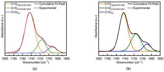 To evaluate the conversion of the acid, the FTIR band in the carbonyl peak region spanning from 1800 to 1660 cm−1 was examined. The band accounts for the carbonyls of unreacted CA, the new cinnamate ester groups formed by the reaction between CA and the ESO oxirane groups, and the triglyceride ester groups of ESO. Therefore, a profile fitting was attempted to quantify the different contributions, assuming that the band was made up of three components, namely, the C=Otriglyceride ester band at 1740 cm−1, the C=Ocinnamate ester band at approximately 1710 cm−1, and the C=OCA band at 1684 cm−1. The central position of each fitted curve was independently evaluated in accordance with the peak of the experimental FTIR curve, whereas the width and height of the fitting curves were left as free parameters. A typical fitting is reported in Figure 2 for the sample at t = 0 (a) and the sample after 1 h at 90 °C (b) (i.e., samples 1ESO+1CA-h0 and 1ESO+1CA-h1, respectively). The deconvoluted spectra fit the experimental measurements reasonably well, under the assumption that each contribution curve had a Gaussian representation; in fact, the determination coefficient R2 was always close to unity.