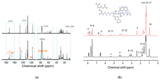 The 1H and 13C NMR spectra of the trans-cinnamic acid are recorded as reference spectra (Figure S2a,b, Supplementary Materials). In the 13C NMR spectrum, the carbonyl at 172.8 and the double-bond carbons at 147 and 117 ppm are visible; in the proton NMR spectrum, the vinyl protons b, c are represented by the two doublets at about 6.6 and 7.9 ppm and the aromatic protons e–g by the resonances in the region from 7.5 to 8 ppm.