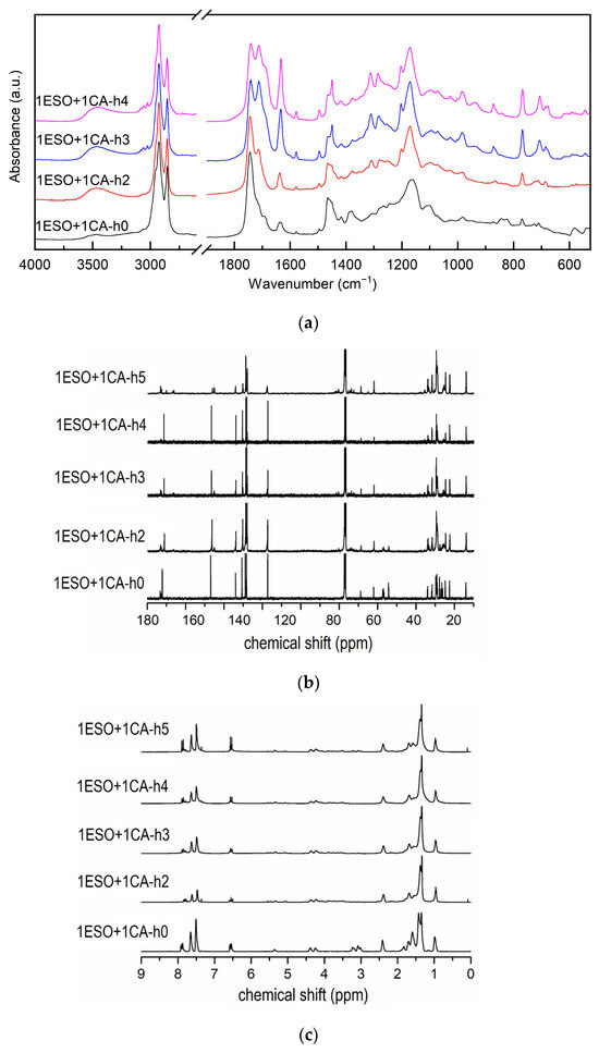 (a) FTIR spectra, (b) 13C NMR spectra, (c) 1H NMR spectra of samples 1ESO+1CA-h1, 1ESO+1CA-h2, 1ESO+1CA-h3, 1ESO+1CA-h4. For the FTIR spectra, the 2700–1900 cm−1 region of the spectrum is not reported in the figure, as no relevant signals were present.