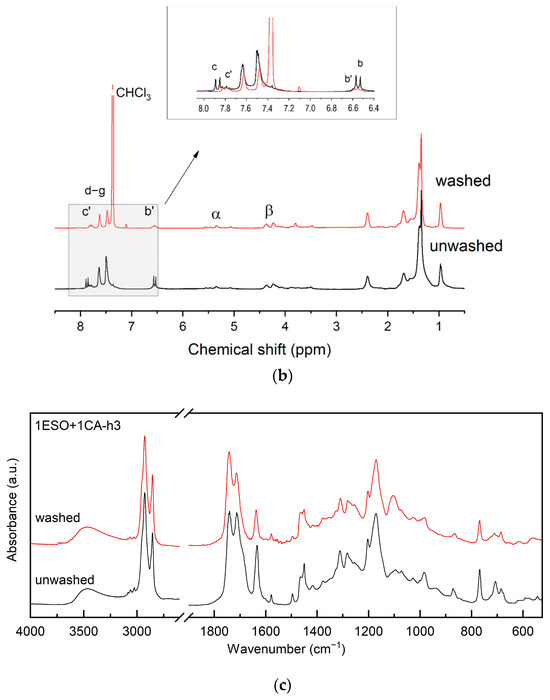 (a) 13C NMR, (b) 1H NMR, and (c) FTIR spectra of sample 1ESO+1CA-h3 before (unwashed) and after (washed) purification in the NaHCO3(aq)/CH2Cl2 solution. The inset in (b) shows the overlapped 1H NMR spectra, highlighting the disappearance of free unreacted CA removed by the purification procedure. For the FTIR spectra, the 2700–1900 cm−1 region of the spectrum was not reported in the figure, as no relevant signals were present.