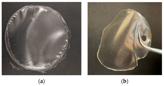 The starch film modified with 40% w/w of 1ESO+1CA-h3 (Y40ESOCA film) was visually compared (Figure 8) with the one plasticized with 40% w/w glycerol (YG film). Both films were transparent according to their diffuse reflectance spectra (Figure S4, Supplementary Materials). Their surfaces were smooth, with no visual defects such as cracks; they both appeared homogeneous, indicating that the incorporation of 1ESO+1CA-h3 into the starch matrix did not give phase separation. However, the film with the new additive exhibited lower flexibility than the films plasticized with glycerol; this was tested simply by rolling the film around rods of different sections.