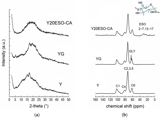 Figure 9b shows the 13C CPMAS NMR spectra of the starch films. The shape of the C1 resonance is well recognized as an extremely sensitive probe of the starch crystallinity [15,36]. In both Y and YG films, it revealed crystalline features, in agreement with XRD results. On the contrary, the sample Y20ESO-CA showed the typical C1 resonance line shape of an amorphous starch [15], as already pointed out by XRD analysis. Moreover, some ESO resonances were visible; signals in the range of 40–20 ppm are, in fact, related to the CH2 backbone of ESO, while the peak at 14.6 ppm can be assigned to its CH3 terminal groups. Unfortunately, resonances of α and β carbons of the ESO additive overlapped with the starch C2, C3, C5, and C6 signals. Also, the resonances of the bonds in the methine region were not detectable due to the overlapping of C4 and C2, C3, and C5 peaks of starch. It was possible to demonstrate that sample Y40ESO-CA had twice the amount of 1ESO-1CA-h3 with respect to Y20ESO-CA), comparing the integrated peak areas of starch (107–55 ppm range) and ESO (37–12 ppm) resonances. Resonances of cinnamate groups were not detectable due to their limited quantities.