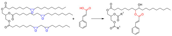 The modification of ESO with cinnamic acid was then attempted and conducted without any catalyst, in different conditions, with FTIR and NMR spectroscopy used to evaluate the effects of stoichiometry and thermal cycles on the ring opening of the epoxide units. The reaction is presented in Scheme 2, where the formation of the β-hydroxyl ester is represented, while the different conditions used are detailed in Table 1.