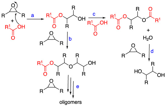 Another possible side reaction is the oligomerization of ESO under acidic conditions: in fact, low molecular weight products produced by the ESO ring-opening have been reported [27,34]. As ESO contains multiple oxiranes, crosslinked homopolymers can be formed.