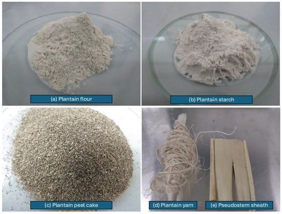 Plantain-based raw materials used for the development of BCMs: (a) plantain flour; (b) plantain starch; (c) plantain peel cake; (d) plantain yarn; (e) pseudostem sheath.