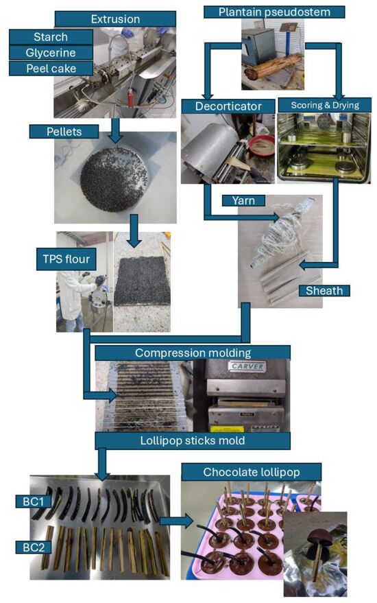 The objective of this work consisted of taking advantage of different plantain by-products, such as flour and starch from the pulp bunch, the peel cake, yarn made from the long lignocellulosic fibers from the sheaths, and the pseudostem sheaths, for the development of two BCMs, using an extrusion process followed by hot compression molding, to validate their use as lollipop sticks, considering the follow-up of its mechanical, physicochemical, viscoelastic, and structural properties after the consumption of the candy. The procedure proposed for the transformation of the BCM in the present research can be adapted for the development of other plastic elements different from lollipop sticks, including the production of single-use plastic products such as spoons, knives, forks, drink stirrers, sticks for hard ice cream or popsicles, and even for the production of trays.