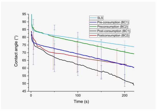 The use of the sheath as a coating on the BC2 lollipop stick gave a contact angle value close to that identified in the SLS despite having a higher degree of water absorption according to the slope behavior (Table 3 and Figure 4); this was because the lignocellulosic fibers that constitute the sheaths have less affinity for water than starch does [45,46]. The presence of residual chocolate on the lollipop stick surfaces after consumption of the bonbon-type confectionery did not generate an increase in the contact angle despite having a hydrophobic or lipophilic character due to its high lipid content and presenting a contact angle between 92.3 and 94.0° [47]. The reduction of the contact angle values in the two types of lollipops stick to values close to 74° in the post-consumption was due to the wetting of the sheath through contact with the consumer’s saliva, affecting the barrier identified in the pre-consumption of the chocolate candy through the hydration of the starch and the remaining pectin in its structure [15,22]. However, the presence of the sheath in the BC2 lollipop stick restricted the characteristic velocity in the absorption of the water droplet by the TPS surface compared to the BC1 lollipop stick [48], generating a lower negative slope. Regarding the BC2 lollipop stick, its slope was similar during the pre-consumption and post-consumption study, relating to a higher stability in its hydrophilic degree due to lignocellulosic fibers in the sheath.