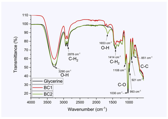 Regarding the identified and characteristic signals in chocolate (Figure 5a), the presence of phenols (3562 to 3329 cm−1), lipids (2914, 2850 and 1733 cm−1), protein (1249 cm−1), and sugar (1066 cm−1) was reported [49,50,51,52,53], with differences identified in the lollipop sticks after consumption of the bonbon-type confectionery. In the case of the BC1 lollipop stick, an increase in the intensity of the stretching band belonging to the hydroxyl group (3293 cm−1) was recorded (Figure 5b), relating to an increase in water absorption [54] from the consumer’s saliva even though the strain signal of the O-H bonds (1647cm−1) did not manifest an increase in its intensity post-consumption. Another signal that increased in intensity corresponded to the carbohydrate fingerprint (1019 cm−1) [55], which was due to the adhesion of the sugar from the chocolate on the surface of the lollipop stick [56]. With the BC2 lollipop stick (Figure 5b), greater additional changes were identified concerning what was manifested in the BC1 lollipop stick, with three characteristic signals of lipids (2914, 2849, and 1735 cm−1) and a signal of the protein (1249 cm−1) from the chocolate identified, explaining the greater capacity in the surface adhesion of the chocolate on the sheath with respect to the surface of the TPS-based matrix. It is also relevant to mention that the representative peak of the strain in the O-H bonds belonging to the BC2 lollipop stick presented a higher intensity post-consumption, confirming the water retention when the lollipop stick was exposed to the consumer’s saliva for a short time. Another analysis that was performed using the present analytical technique was related to the components that diffused in 50% ethanol in the global migration test, which identified similar signals to the glycerin and the resulting migration of the two lollipop sticks as reported by Arofai et al., 2024 [57], finding the band of hydroxyl groups at 3290 cm−1, and symmetric and asymmetric stretching of CH2 bonds at 2878 and 1414 cm−1, respectively; C-O bonds were found at 1108, 1030, and 993 cm−1, identifying the presence of secondary and primary alcohols (Figure 6). Meanwhile, the strain signals at 921 and 851 cm−1 represent C-C and C-C-O bonds and aggregates of glycerol hydroxyl groups. Among the impurities in the migration resulting from the two lollipop sticks, absorbed moisture was identified from a strain peak at 1653 cm−1.