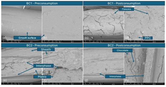 SEM micrographs of the walls of biobased plantain lollipop sticks: (a,b) BC1 pre-consumer; (c,d) BC1 post-consumer; (e,f) BC2 pre-consumer; (g,h) BC2 post-consumer.
