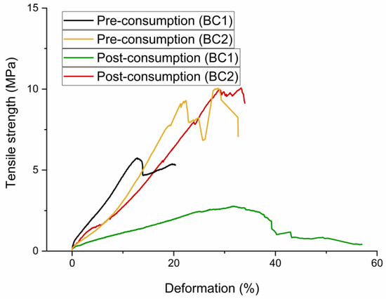 The SLS presented a higher σmax concerning the BC1 and BC2 lollipop sticks from its composition (Table 4 and Figure 9) since PP constitutes the SLS, generating values between 20 and 27 MPa [65,66]. In the case of biobased sticks, the use of the sheath contributed to a higher σmax than that granted by the yarn, considering the presence of the highest amount of reinforcement (37%), employing long fibers with unidirectional orientation in the sheaths that constitute the BC2 lollipop stick and the lignocellulosic fibers it contains, possessing σmax values between 232.40 and 489.54 MPa [22,67]. Post-consumption, a reduction of 55.72% in the σmax of the BC1 lollipop stick was generated, while, when using the sheath as reinforcement in the BC2 lollipop stick, a loss of 6.81% was presented. Despite the exposure of the two types of BCM to chocolate at a temperature close to 32 °C for molding and cooling, followed by storage for 10 days and subsequent consumption, and being moistened with some mechanical exposure during handling and consumption of the confection, the function of the sheath restricted the passage of moisture during chocolate consumption, avoiding the rapid speed in the loss of mechanical properties from the wetting of the thermoplastic matrix [15] which was manifested in the BC1 lollipop stick, since the free spaces between the reinforcement and the matrix evidenced through SEM images increased the capacity for water absorption and affected its mechanical behavior [68]. Similarly, the wetting generated in the biobased lollipop sticks from chocolate consumption promoted changes in the E and the ε, reducing the structural stiffness and increasing strain by retaining higher moisture content. Despite the reduction of the σmax and E of the BC2 lollipop stick post-consumption, its σmax retained a competitive value when compared to that reported by [69], obtaining a value of 8.16 MPa in a BCM constituted by flour from plantain peel, plasticized with 50% glycerin, and reinforced with 6.54% of fibers from plantain pseudostem. In comparison, the E was higher, with a value of 281 MPa. In the case of Cheng, 2019 [70], a σmax of 12.15 MPa and an E of 506 MPa were reported when using a corn TPS reinforced with 23.44% of lignocellulosic fibers and 5.13% of calcium carbonate (CaCO3). When compared with those obtained by Rodriguez-Soto et al., 2019 [18], the σmax and E were higher with the use of a BCM formed by a bilayer sheet using cassava acetylated thermoplastic starch (first layer) and a sheath from the plantain pseudostem by hot compression molding, obtaining values of 50 MPa and 2.7 GPa, respectively.