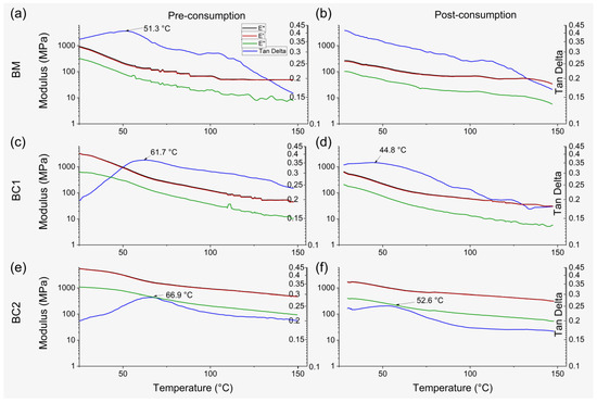 Dynamic–mechanical behavior of biobased plantain lollipop sticks pre-consumption and post-consumption: (a,b) BM; (c,d) BC1; (e,f) BC2. Complexe modulus (E*); Storage modulus (E′); Loss modulus (E″).