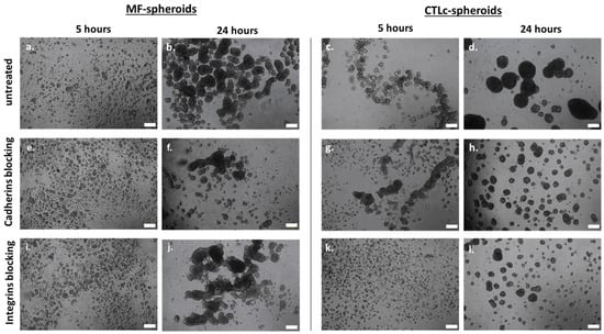 Optical images of MF- and CTLc-spheroids in the presence of integrin- and cadherin-blocking antibodies. The dynamics of spheroid formation in untreated MF-spheroids (a,b) and CTLc-spheroids (c,d) was compared to the dynamics of spheroid formation in the presence of anti-cadherin (e–h) and anti-integrin (i–l) antibodies, at 5 and 24 h from cell seeding (scale bar: 200 μm).