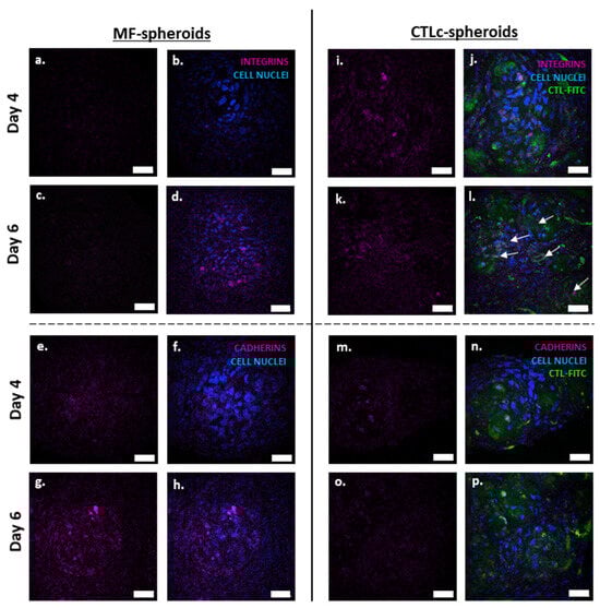 Immunohistochemical images of integrins and cadherins in MF- and CTLc-spheroids on days 4 and 6. Integrins (a–d,i–l) and cadherins (e–h,m–p) are stained in violet; cell nuclei are stained in blue (DAPI). In CTLc-spheroids, CTL-FITC is stained in green. White arrows indicate overlaps between CTL-FITC and protein clusters (scale bar: 50 µm).