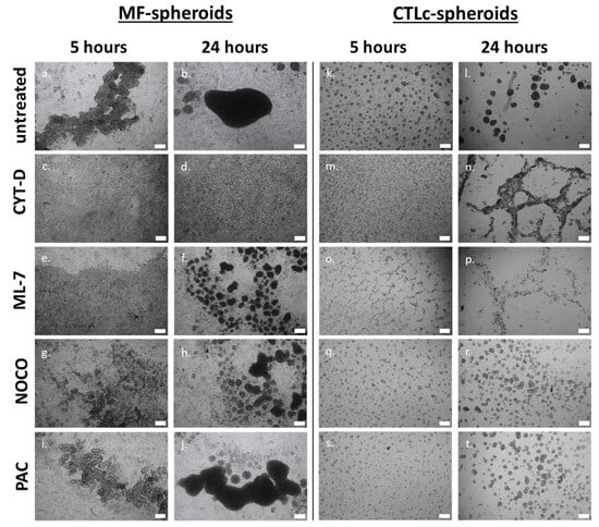 Optical images of MF- and CTLc-spheroids treated with compounds interfering with the dynamics of cytoskeletal rearrangements. The dynamics of spheroid formation in untreated MF-spheroids (a,b) and CTLc-spheroids (k,l) was compared to the dynamics of spheroid formation in the presence of Cytochalasin D—CYT-D (c,d,m,n), ML-7 (e,f,o,p), nocodazole—NOCO (g,h,q,r), and paclitaxel—PAC (i,j,s,t) at 5 and 24 h (scale bar: 200 μm).