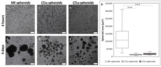 Optical images of MF-spheroids (a,b), CTLc-spheroids (c,d), and CTLs-spheroids (e,f) at 5 h and 4 days (scale bar: 200 μm). Dimensional distribution of spheroids on day 4 (g); (*** = p-value < 0.001).