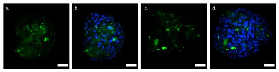 By seeding cells in the presence of fluorescently labeled CTL, confocal visualization revealed that in CTLs-spheroids, the polymer is incorporated into spheroids (Figure 5c,d) and the cells are organized as concentric layers around CTL-FITC domains, resembling the distribution of the polysaccharide in CTLc-spheroids (Figure 5a,b). It can be assumed that in both systems, the cells bind to CTL, leading to the formation of hybrid polymer–cell spheroids in which the polymer is embedded.