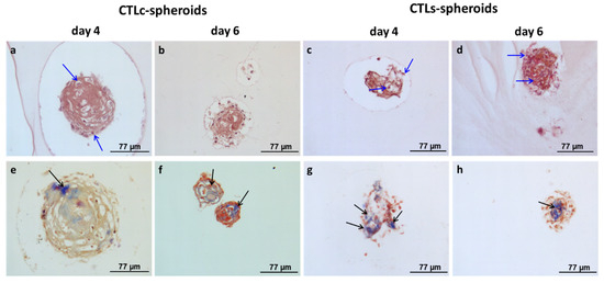 Hematoxylin–eosin staining (a–d) and Masson’s Trichrome staining (e–h) on CTLc-spheroids and CTLs-spheroids on day 4 and day 6. Collagen appears as blue domains inside spheroids (scale bar 77 μm; magnification: 40×). Blue arrows indicate viable cells; black arrows indicate collagen, which appears as blue domains inside spheroids.