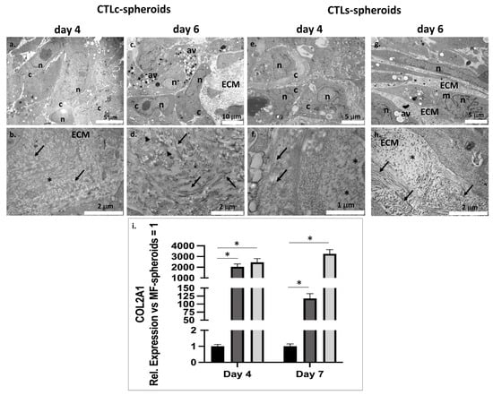 TEM images of CTLc- and CTLs-spheroids on day 4 and day 6 (a–h) and COL-2 gene expression by qPCR (i). In CTLc-spheroids on day 4, the cells show a polygonal shape, with a visible nucleus (n) and cytoplasm (c) (a). Details of ECM showing the presence of procollagen protein (black arrow) and CTL polymer (*) is reported (b). On day 6, MSCs in CTLc-spheroids show a polygonal and spindle shape. Lysosomes and autophagic vesicles (av) appear in the cytoplasm (c). The nucleus (n), mitochondria (m), and extracellular matrix (ECM) are visible (c). Details of ECM showing collagen fibers both in parallel (arrows) and transversal orientation (arrowheads) are reported (d). In CTLs-spheroids on day 4, the cells show a polygonal shape. Nucleus (n) and cytoplasm (c) can be detected (e). Details of extracellular matrix (ECM) showing the presence of procollagen protein (arrow) and CTL material (*) (f). In CTLs-spheroids on day 6, the cells showed a polygonal and spindle shape with nucleus (n), mitochondria (m), and extracellular matrix (ECM) visible. Lysosomes and autophagic vesicles (av) are detected in the cytoplasm (g). Details of extracellular matrix (ECM) showing collagen fibers in parallel and transversal orientation (arrows) and CTL (*) (h). Scale bar: (a): 5 µm; (b): 2 µm; (c): 10 µm; (d): 2 µm; (e): 5 µm; (f): 1 µm; (g): 5 µm; (h): 2 µm. Gene expression analysis shows that the expression of COL2A1 is anticipated in CTLc- and CTLs-spheroids compared to MF-spheroids. Data were normalized to the housekeeping gene GAPDH, and the relative expression of each gene was calibrated to that of MF-spheroids for each time point (set as 1). Data are presented as mean ± SE (black bars: MF-spheroids; dark gray bars: CTLc-spheroids; light gray bars: CTLs-spheroids) (i). (* = p-value < 0.05; unpaired t-test analysis).