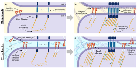 Considering these data, it can be hypothesized that, in the presence of CTL, the dynamics of spheroid formation involves three main phases. In the first phase, integrin-mediated cell–polymer interactions are established, without requiring polymerized actin. This process is followed by a second phase, where cadherin-mediated cell–cell interactions predominate, and these interactions are stabilized by actin polymerization. The third phase is characterized by the progressive formation and strengthening of cadherin-based cell–cell junctions and integrin-based focal adhesions, with a densification of the spheroidal structures and further coalescence, which requires the polymerization of actin filaments. A summary of the role exerted by the different cellular components in the dynamics of MF- and CTLc-spheroids is reported in Figure 8a–d and Table 1.