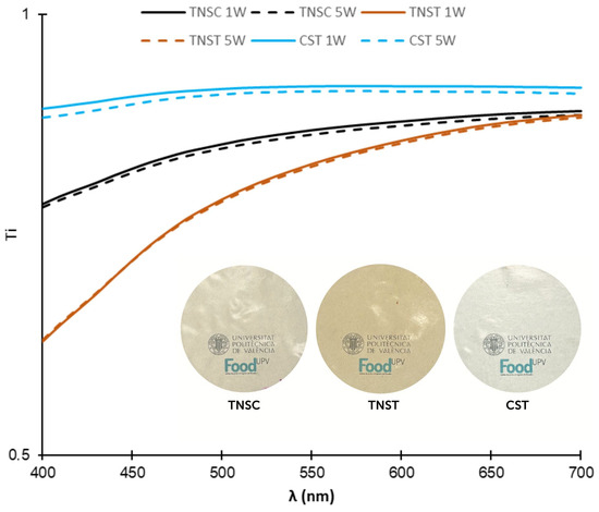 Internal transmittance spectra and visual appearance of the different films based on starch from horchata solid residue obtained by casting (TNSC) and thermal processing (TNST) and corn starch films made by thermal processing (CST) at one (1W) and five (5W) weeks of storage at 53% RH and 25 °C.