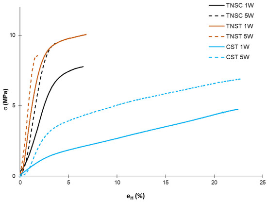 Typical stress–strain curves of the different films based on starch from horchata solid residue obtained by casting (TNSC) and thermal processing (TNST) methods and thermoprocessed corn starch films (CST) at 1 week (1W) and 5 weeks (5W) of storage.
